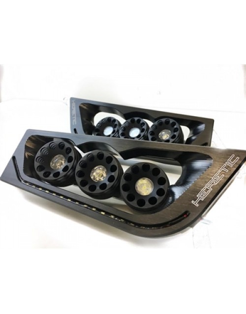 Made from 6061 billet aluminum, anodized bright dip black or raw aluminum for custom colors. Each light consists of 3 cylinders, Heretic's proprietary chipset, CREE XML2 LEDs. For durability each cylinder features a double o-ring design to keep out water, moisture and dust. ALL OF OUR PRODUCTS ARE MANUFACTURED AND ASSEMBLED IN SLC, UTAH AKA the good old USA!